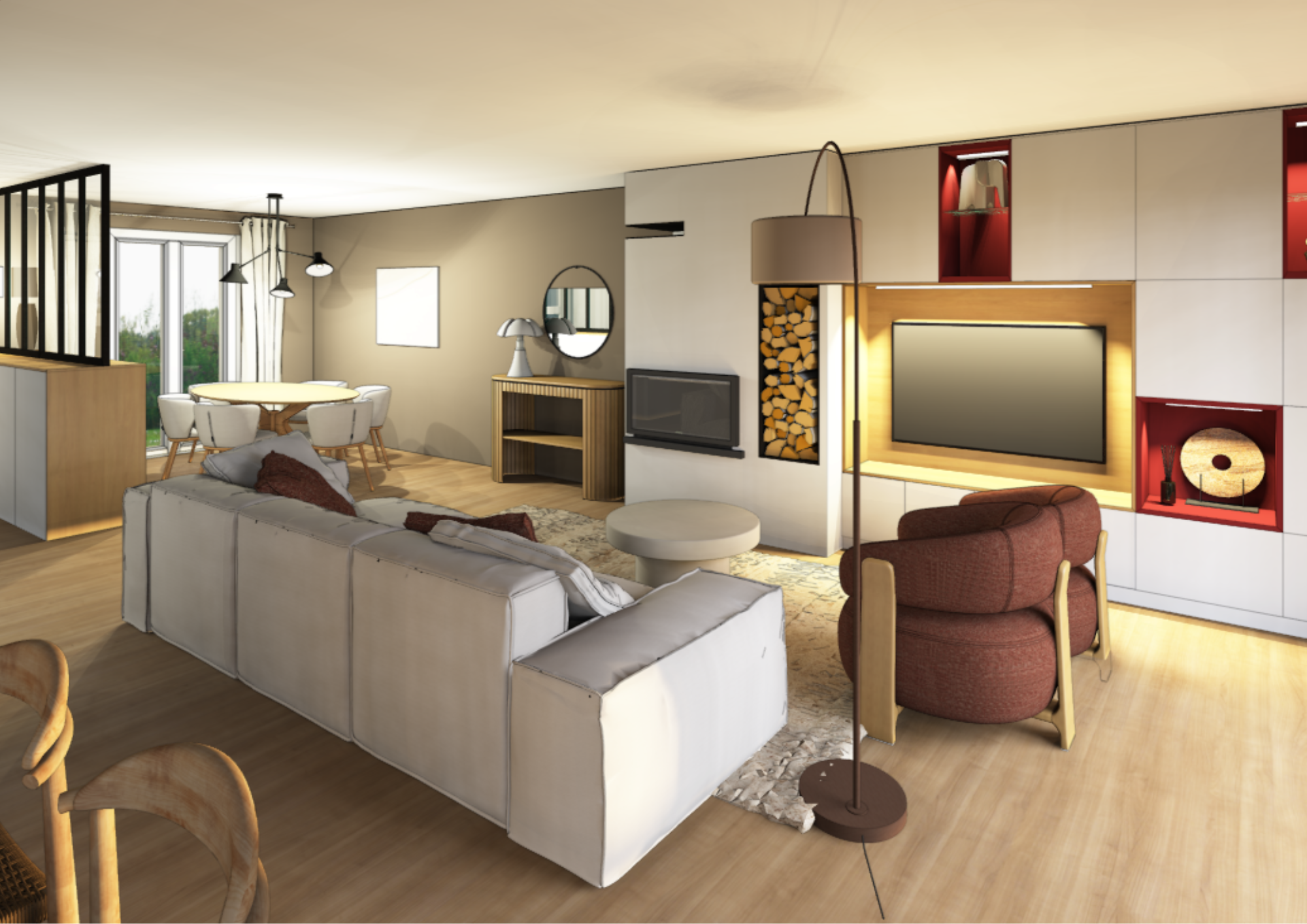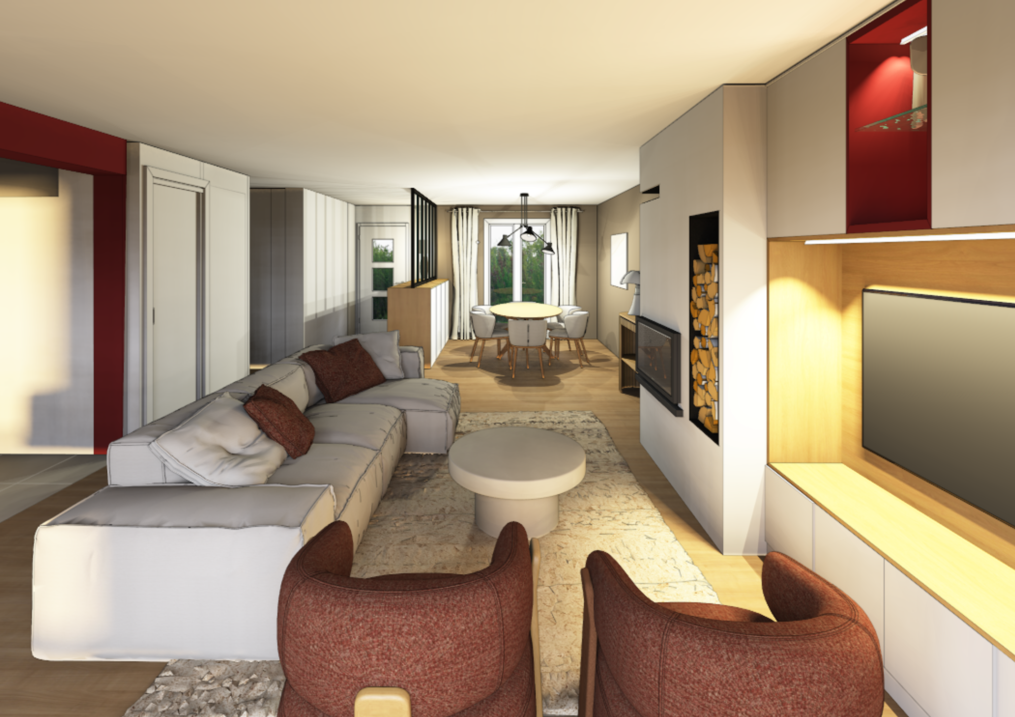 Le salon a été réorganisé autour de la cheminée avec l’ajout d’une bibliothèque sur-mesure intégrant la TV et des éclairages d’ambiance. La cuisine prend désormais place dans l’ancien coin repas, avec un ilot central convivial pour les repas du quotidien.