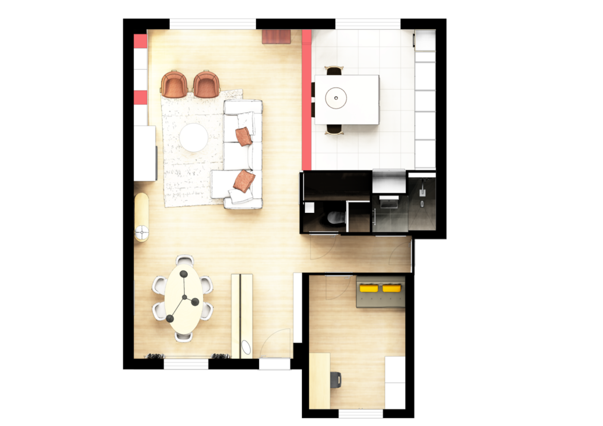 Le réaménagement impliquait plusieurs défis : repenser l’espace sous l’escalier, auparavant dédié à un rangement peu pratique, déplacer les toilettes pour créer une vraie salle de douche, tout en ajoutant des rangements fonctionnels dans la cuisine, l’entrée et le salon.